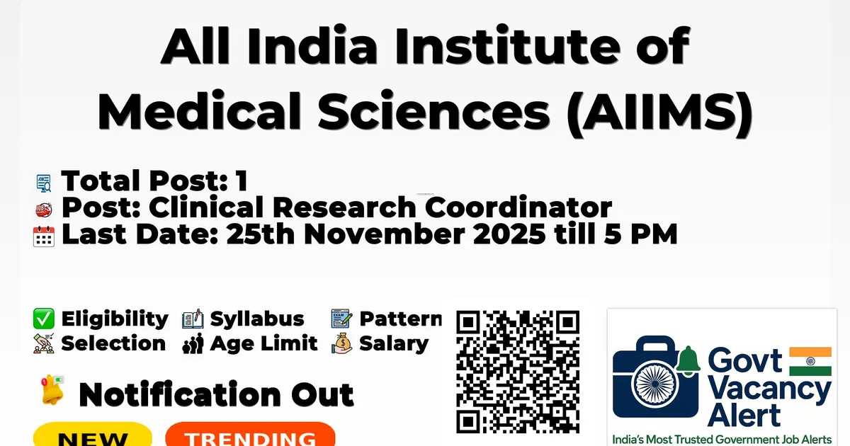 Company Name All India Institute of Medical Sciences (AIIMS) Post Name Clinical Research Coordinator No of Posts 1 Salary Rs. 30,000/- per month Qualification Bachelor Degree in relevant subject with 2 years experience or Master Degree in relevant subject Age Limit Up to 35 years (Relaxation: 5 years for SC/ST, 3 years for OBC) Last Date for Apply 25th November 2025 till 5 PM Official Website Not specified