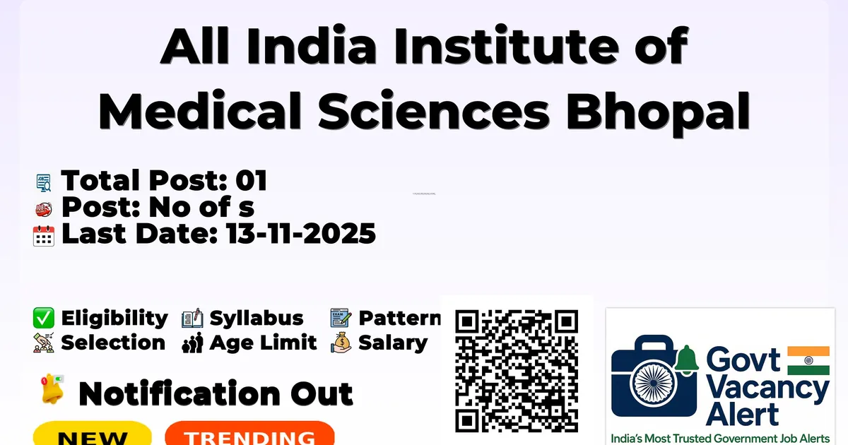 All India Institute of Medical Sciences Bhopal (AIIMS Bhopal) has released an official notification for the recruitment of 01 Junior Research Fellow Posts. Interested and eligible candidates can apply Offline through the official AIIMS Bhopal website. The last date to submit the application form is 13-11-2025. In this article, you’ll find the AIIMS Bhopal Junior Research Fellow Posts recruitment details, including eligibility criteria, age limit, salary structure, selection process, application steps, and direct links to the official notification and Offline application form.