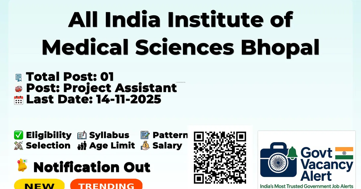 Company Name All India Institute of Medical Sciences Bhopal (AIIMS Bhopal) Post Name Project Assistant No of Posts 01 Pay Matrix Rs 20,000 Qualification B.Sc Age Limit 50 years Last Date for Apply 14-11-2025 Official Website aiimsbhopal.edu.in