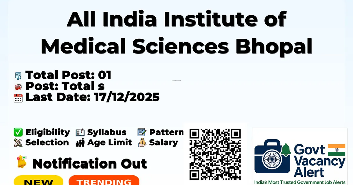 All India Institute of Medical Sciences Bhopal (AIIMS Bhopal) has released an official notification for the recruitment of 01 Research Assistant Posts. Interested and eligible candidates can apply Offline through the official AIIMS Bhopal website. The last date to submit the application form is 17-12-2025. In this article, you’ll find the AIIMS Bhopal Research Assistant Posts recruitment details, including eligibility criteria, age limit, salary structure, selection process, application steps, and direct links to the official notification and Offline application form.
