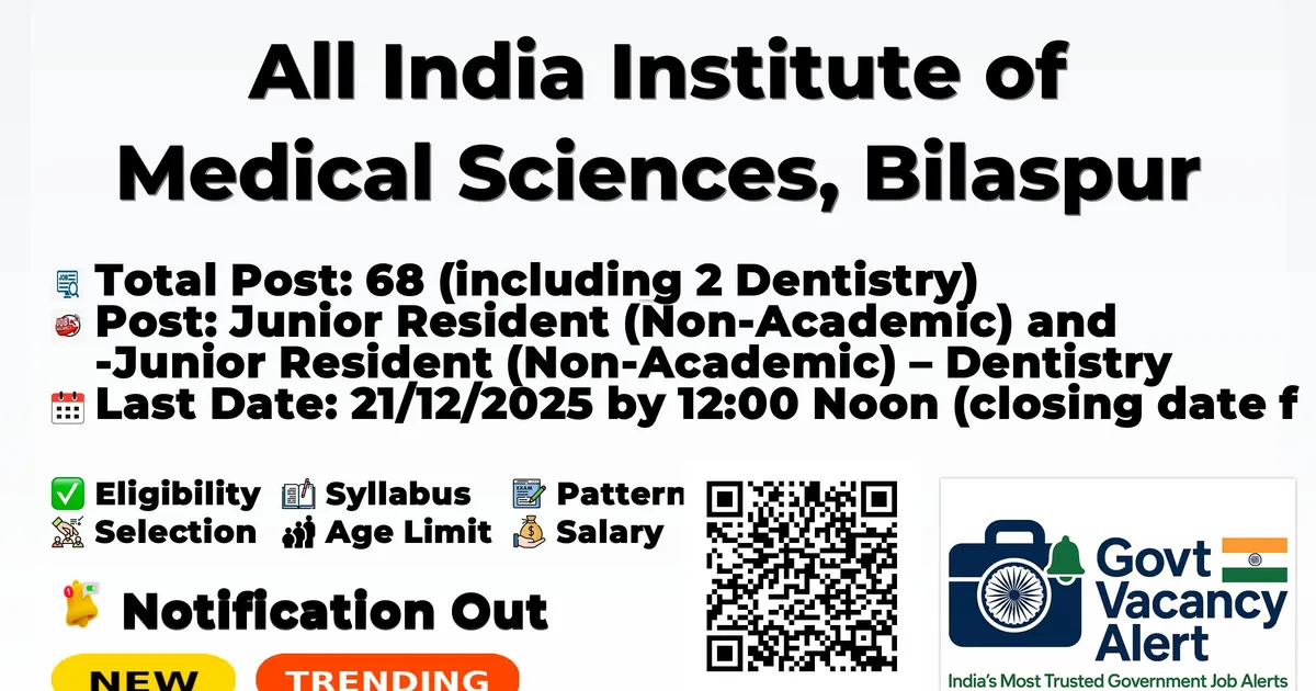 Company Name All India Institute of Medical Sciences, Bilaspur (AIIMS Bilaspur) Post Name Junior Resident (Non-Academic) and Junior Resident (Non-Academic) – Dentistry No of Posts 68 (including 2 Dentistry) Salary Junior Residents (Non-Academic): Level-10 in pay matrix with a minimum of Rs. 56,100/- per month plus usual allowances as applicable. Qualification MBBS with registration in Central/State Medical Council for Junior Resident (Non-Academic); BDS recognized by DCI, completed (including internship) within 5 years and valid State Dental Council registration for Junior Resident (Dentistry); valid pass certificate as on last date of receipt of applications. Age Limit Upper age limit 30 years as on the crucial date (last date of submission of online applications); permissible relaxation as per Government of India orders with documentary proof. Last Date for Apply 21/12/2025 by 12:00 Noon (closing date for submission of application through Google Form). Official Website https://aiimsbilaspur.edu.in