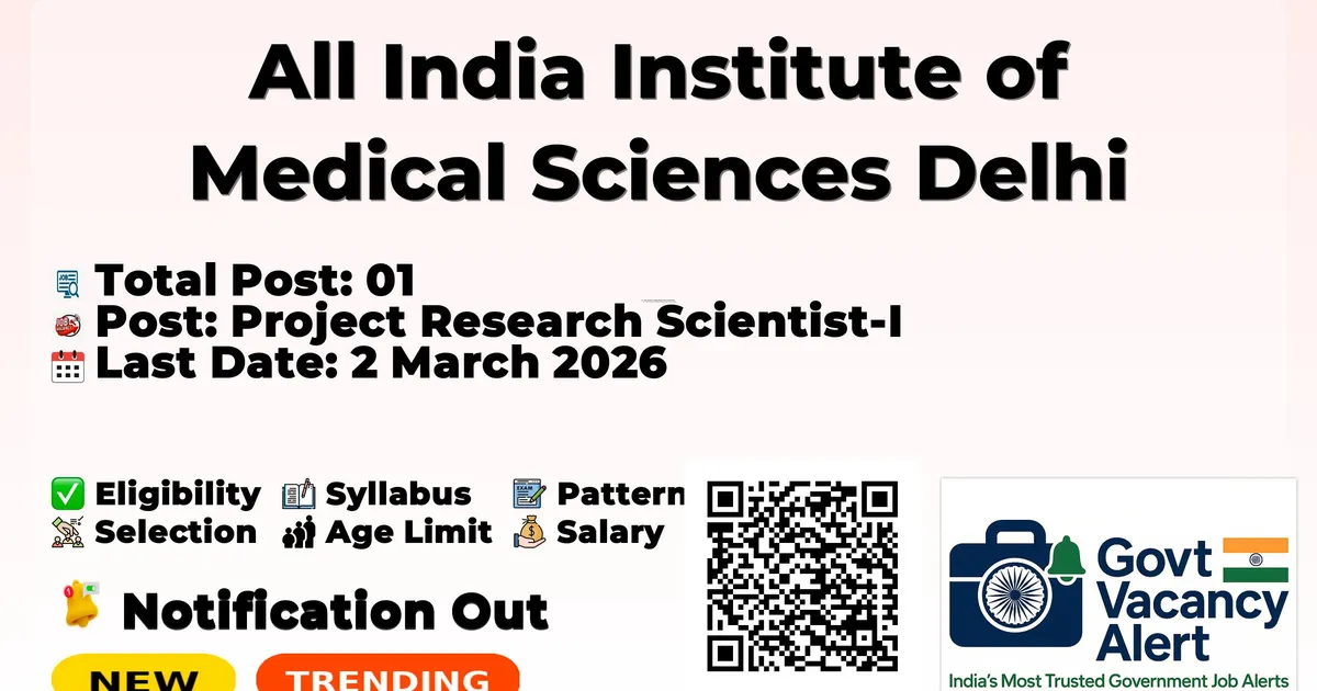 All India Institute of Medical Sciences Delhi (AIIMS Delhi) has released an official notification for the recruitment of 01 Project Research Scientist I Posts. Interested and eligible candidates can apply Offline through the official AIIMS Delhi website. The last date to submit the application form is 02-03-2026. In this article, you’ll find the AIIMS Delhi Project Research Scientist I Posts recruitment details, including eligibility criteria, age limit, salary structure, selection process, application steps, and direct links to the official notification and Offline application form.