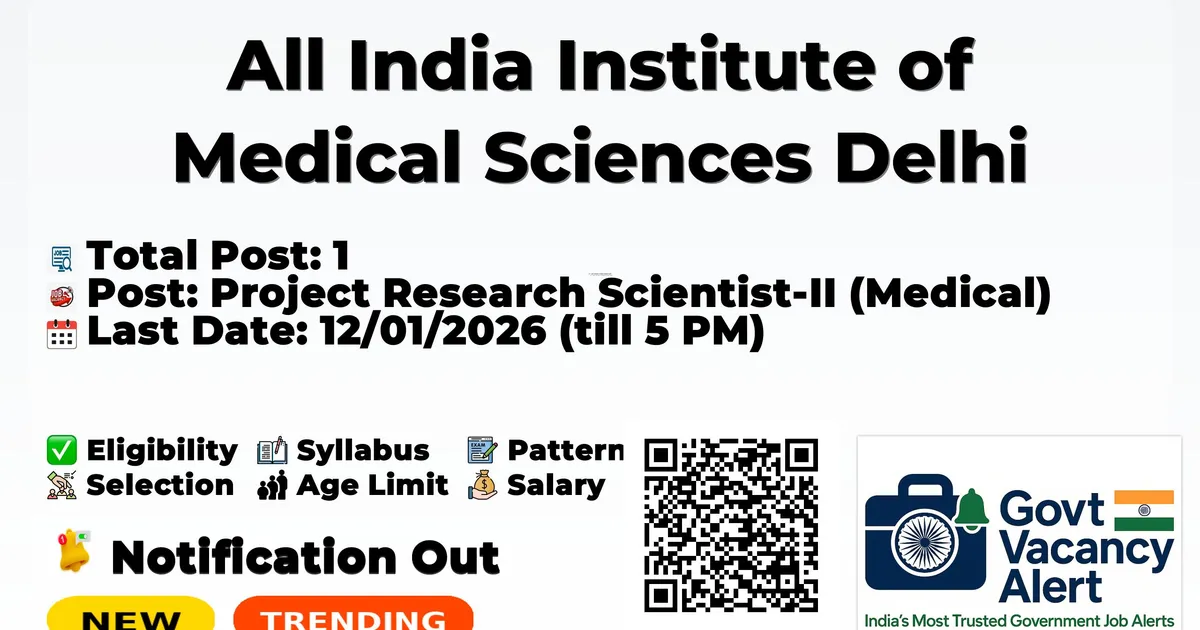 All India Institute of Medical Sciences Delhi (AIIMS Delhi) has released an official notification for the recruitment of 01 Project Research Scientist II Posts. Interested and eligible candidates can apply Offline through the official AIIMS Delhi website. The last date to submit the application form is 12-01-2026. In this article, you’ll find the AIIMS Delhi Project Research Scientist II Posts recruitment details, including eligibility criteria, age limit, salary structure, selection process, application steps, and direct links to the official notification and Offline application form.
