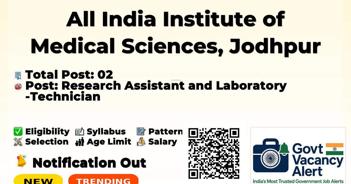 Company Name All India Institute of Medical Sciences, Jodhpur (AIIMS Jodhpur) Advt No. AIIMS/Micro/Rec./2026/018 Post Name Research Assistant and Laboratory Technician No of Posts 02 Salary Rs. 20,000 + HRA to Rs. 35,000 (Consolidated) Qualification Graduate in Science / Post Graduate degree / B.Sc. / Intermediate + Diploma in MLT (as per post) Age Limit Up to 25 to 30 years Official Website https://www.aiimsjodhpur.edu.in/