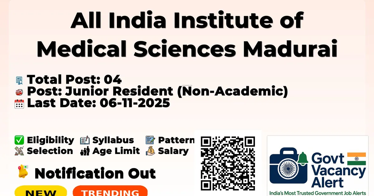 All India Institute of Medical Sciences Madurai (AIIMS Madurai) has released an official notification for the recruitment of 04 Junior Resident Posts. Interested and eligible candidates can apply Online through the official AIIMS Madurai website. The last date to submit the application form is 06-11-2025. In this article, you’ll find the AIIMS Madurai Junior Resident Posts recruitment details, including eligibility criteria, age limit, salary structure, selection process, application steps, and direct links to the official notification and Online application form.