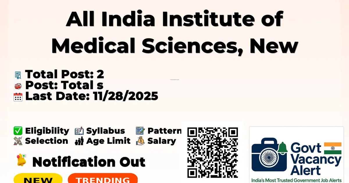 Company Name All India Institute of Medical Sciences, New Delhi (AIIMS) Post Name Senior Project Associate, Project Technical Support III No of Posts 2 Salary Rs. 42,000 + HRA (Senior Project Associate), Rs. 28,000 + HRA (Project Technical Support III) Qualification Senior Project Associate: Master’s or Bachelor’s in related sciences with 4 years’ experience, or Doctoral/MD/MS Project Technical Support III: Three-year graduate with 3 years’ experience or PG in the relevant field Age Limit 35 to 40 years Start Date for Apply 11/14/2025 Last Date for Apply 11/28/2025 Official Website aiims.edu