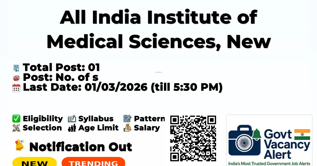 Company Name All India Institute of Medical Sciences, New Delhi Post Name Project Technical Support -III No of Posts 01 Salary Rs. 35,560 (including 27% HRA) as per ICMR rules Qualification Graduate or PG in the relevant field Age Limit 35 years Start Date for Apply 09/02/2026 Last Date for Apply 01/03/2026 (till 5:30 PM) Official Website https://www.aiims.edu