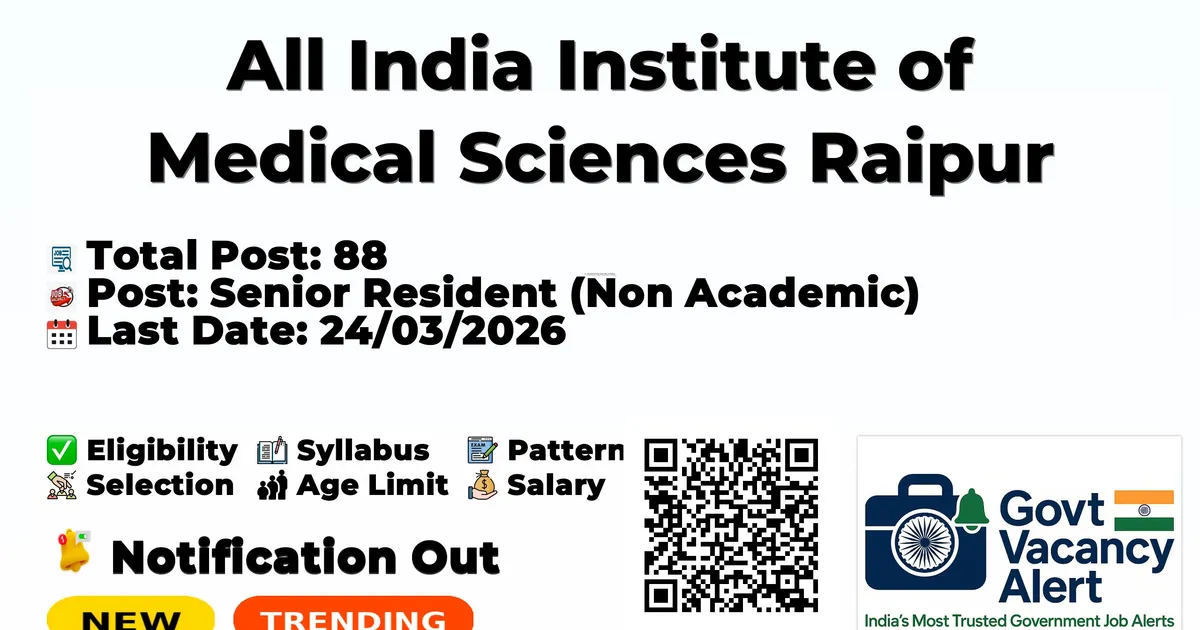 Company Name All India Institute of Medical Sciences Raipur (AIIMS Raipur) Post Name Senior Resident (Non Academic) No of Posts 88 Advt No No.9/327/2026/Recruit./Reg./AIIMSRPR/760 Salary Rs. 67,700/- (Level-11) per month + usual allowances including NPA (if applicable) Qualification Postgraduate Medical Degree (MD/MS/DNB/Diploma) in respective discipline Age Limit 45 years (as on 24/03/2026) with relaxations Start Date for Apply 14/03/2026 Last Date for Apply 24/03/2026 Official Website https://www.aiimsraipur.edu.in