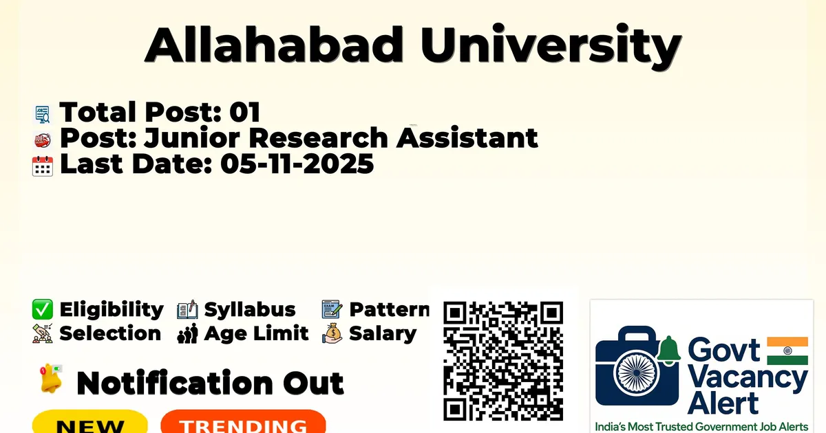Company Name Allahabad University Post Name Junior Research Assistant No of Posts 01 Pay Matrix Rs 25,000 to 28000 Qualification M.Sc Age Limit 28 years Start Date for Apply 27-10-2025 Last Date for Apply 05-11-2025 Official Website allduniv.ac.in