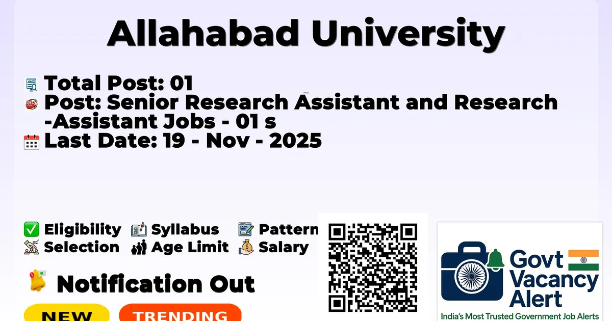 Allahabad University has announced the official notification for 2025. To fill up the vacancies for Senior Research Assistant and Research Assistant Jobs. Those candidates who have qualified in the 10th Pass can grab this chance and apply for the Allahabad University Recruitment 2025. Here we include the age limit, selection process, salary structure, education details, application fee, and how to apply for these posts. Interested and eligible candidates can apply before th last date.