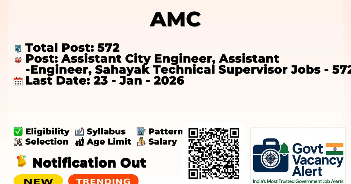 The Ahmedabad Municipal Corporation (AMC) has officially released the notification to fill the vacancies of 572 Assistant City Engineer, Assistant Engineer, and Sahayak Technical Supervisor Jobs. Interested and eligible candidates can use this opportunity to apply for these posts before the last date of application. Candidates who have completed their B.E./B. Tech in Civil Engineering can apply for the AMC Notification 2026. The interested applicants can apply in online mode. Here we have mentioned the education details, age limit, selection process, application fee, salary, and how to apply for these posts before the deadline. The application dates have already begun.