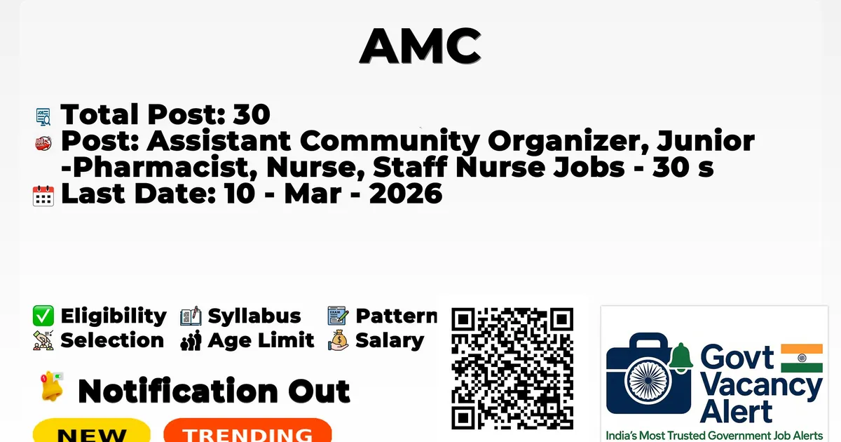 Amdavad Municipal Corporation (AMC) has announced the official notification for the recruitment of 30 Assistant Community Organizers, Junior Pharmacists, Nurses, and Staff Nurse Jobs. Those candidates who have qualified in the Any Degree, D.Pharm, B.Sc Nursing, and GNM can use this chance and apply for the AMC Recruitment 2026. Here we included the age limit, selection process, salary structure, education details, application fee, and how to apply for these posts. Interested and eligible candidates can apply before the lastdate of application.