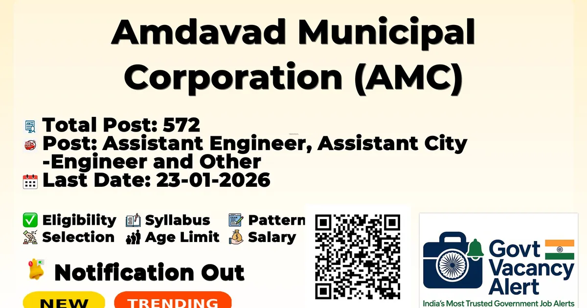 Company Name Amdavad Municipal Corporation (AMC) Post Name Assistant Engineer, Assistant City Engineer and Other No of Posts 572 Salary Rs 31,340 to 1,67,800 Qualification B.Tech/B.E in relevant discipline Age Limit None to 37 years Start Date for Apply Online 08-01-2026 Last Date for Apply Online 23-01-2026 Official Website ahmedabadcity.gov.in