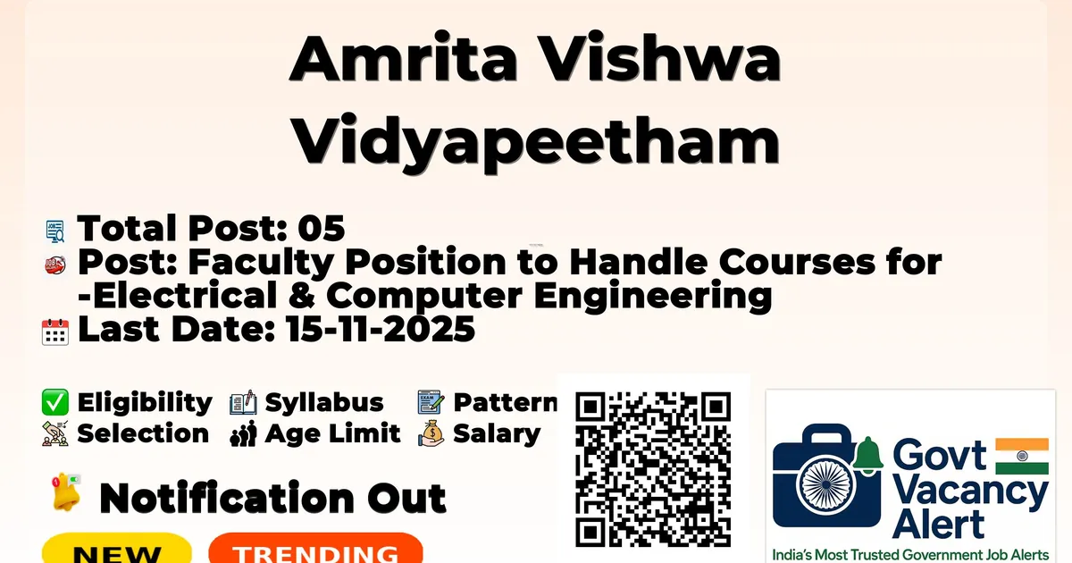 Amrita Vishwa Vidyapeetham has released an official notification for the recruitment of 05 Faculty Posts. Interested and eligible candidates can apply Online through the official Amrita Vishwa Vidyapeetham website. The last date to submit the application form is 15-11-2025. In this article, you’ll find the Amrita Vishwa Vidyapeetham Faculty Posts recruitment details, including eligibility criteria, age limit, salary structure, selection process, application steps, and direct links to the official notification and Online application form.