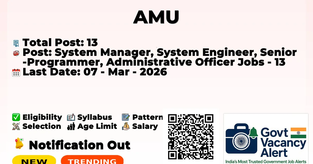 The Aligarh Muslim University (AMU) has officially released the notification to fill the vacancies of 13 System Manager, System Engineer, Senior Programmer, and Administrative Officer Jobs. Interested and eligibile candidates can use this opportunity to apply for these posts before the last date of application. Candidates who have completed their B.E./B. Tech, M.E./M. Tech in Computer Science Engineering, MCA, and M.Sc. can apply for the AMU Notification 2026. The interested applicants can apply in offline mode. Here we have mentioned the education details, age limit, selection process, application fee, salary, and how to apply for these posts before the deadline. The application dates have already begun.