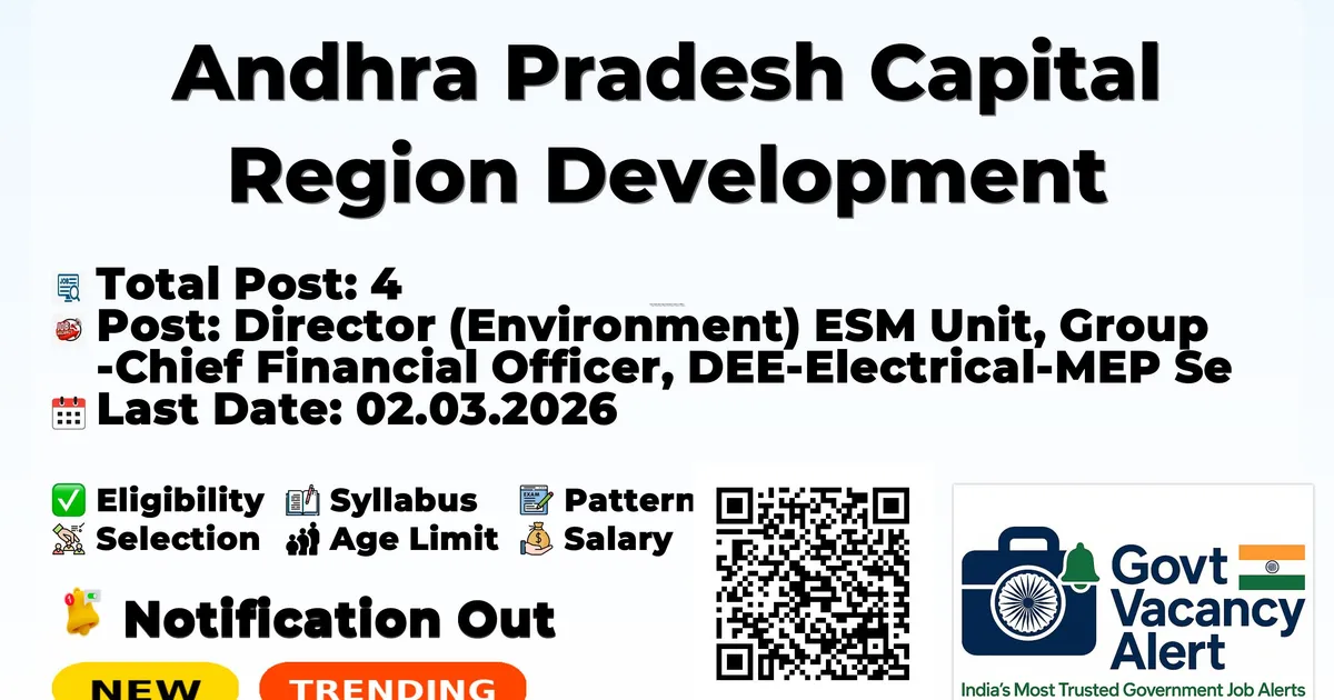 Company Name Andhra Pradesh Capital Region Development Authority (APCRDA) Post Name Director (Environment) ESM Unit, Group Chief Financial Officer, DEE-Electrical-MEP Services, MIS Operator No of Posts 4 Advt No 01/2026 Salary Fixed consolidated pay commensurate with qualification and experience as per Government norms Qualification Position-specific (Master’s/Ph.D., CAIIB + 20 yrs, B.Tech Electrical + 15 yrs MEP, Graduate + 3 yrs) Age Limit Not Mentioned Start Date for Apply 24.02.2026 Last Date for Apply 02.03.2026 Official Website https://crda.ap.gov.in