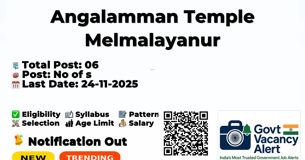 •  Address to which the applicant should apply: Assistant Commissioner/Executive Officer, Arulmigu Angalamman Temple, Melmalayanur (M) Circle, Villupuram District-604204.