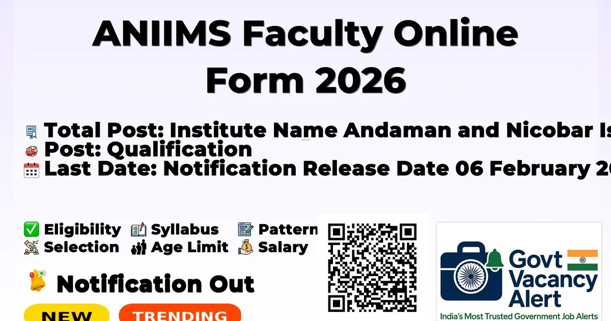 Institute Name Andaman and Nicobar Islands Institute of Medical Sciences (ANIIMS), Sri VijayaPuram Post Name Professor / Associate Professor / Assistant Professor Total Vacancy Count 34 Posts Disciplines Anatomy / Biochemistry / Pharmacology / Community Medicine / General Medicine / Psychiatry / Dermatology / General Surgery / Orthopaedics / Anaesthesiology / Radio-Diagnosis / Paediatrics / Ophthalmology Qualification MBBS + MD/MS/DNB in relevant discipline (as per NMC regulations 2025) Upper Age Limit Not Specified (Retired candidates eligible) Engagement Period 5 Years (extendable by 2 years based on performance) Monthly Salary Rs. 2,05,000–2,75,000/- + Allowances (post-wise) Apply Online Start Date 07/02/2026 Soft Copy Last Date 28/02/2026 Hard Copy Last Date 07/03/2026 Apply Mode Offline / Email Official Website https://andamannicobar.gov.in/
