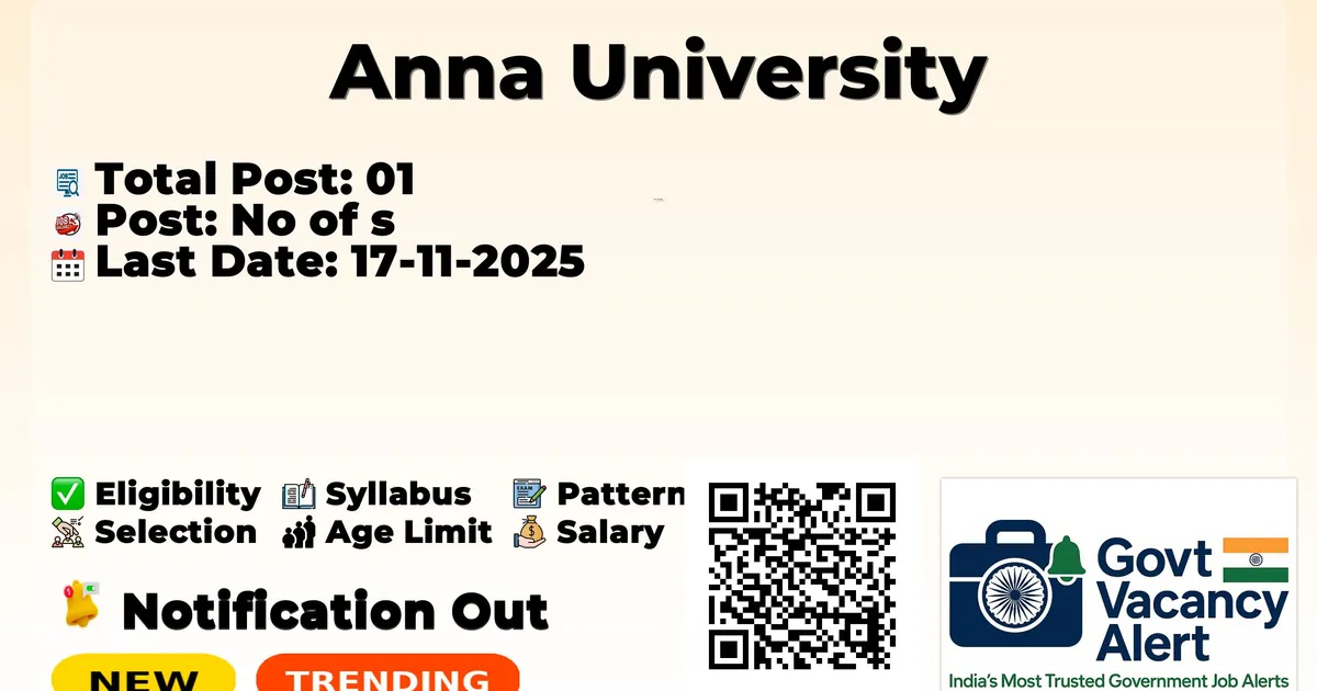 Company Name Anna University Post Name Project Associate I No of Posts 01 Pay Matrix Rs.35,000 Qualification B.Tech/ B.E, M.Sc Last Date for Apply 17-11-2025 Official Website annauniv.edu