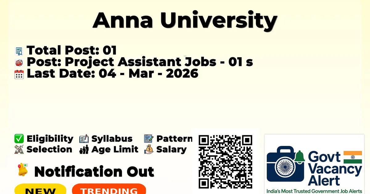 Anna University has released an official notification for the recruitment of various Project Assistant Posts. Those candidates who have qualified in the B.E/ B.Tech, M.E/ M.Tech can grab this chance and apply for the Anna University Notification 2026. Here, we included the age limit, selection process, salary structure, education details, application fee, and how to apply for these posts. Interested and eligible candidates can apply before the last date of application.