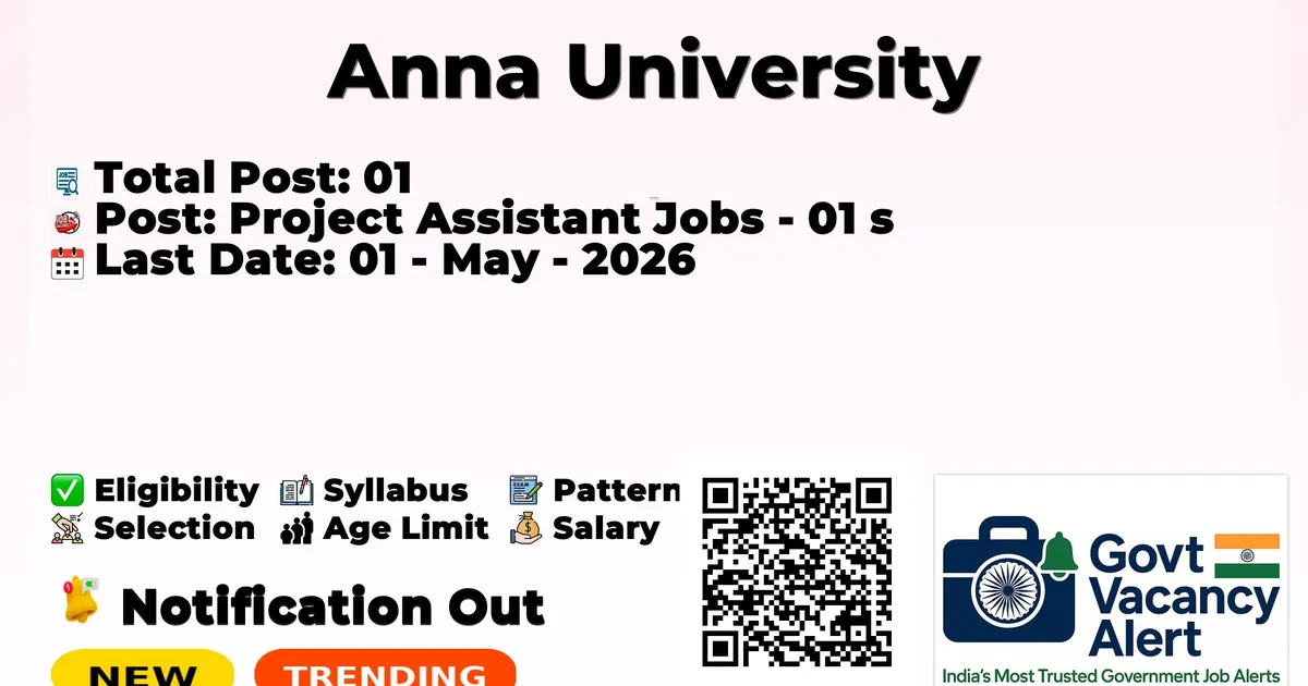 Anna University has released the official notification for the recruitment of various Project Assistant Jobs. Those candidates who have qualified in the B.E/ B.Tech, M.E/ M.Tech can grab this chance and apply for the Anna University Notification 2026. Here, we included the age limit, selection process, salary structure, education details, application fee, and how to apply for these posts. Interested and eligible candidates can apply on or before the last date of application.
