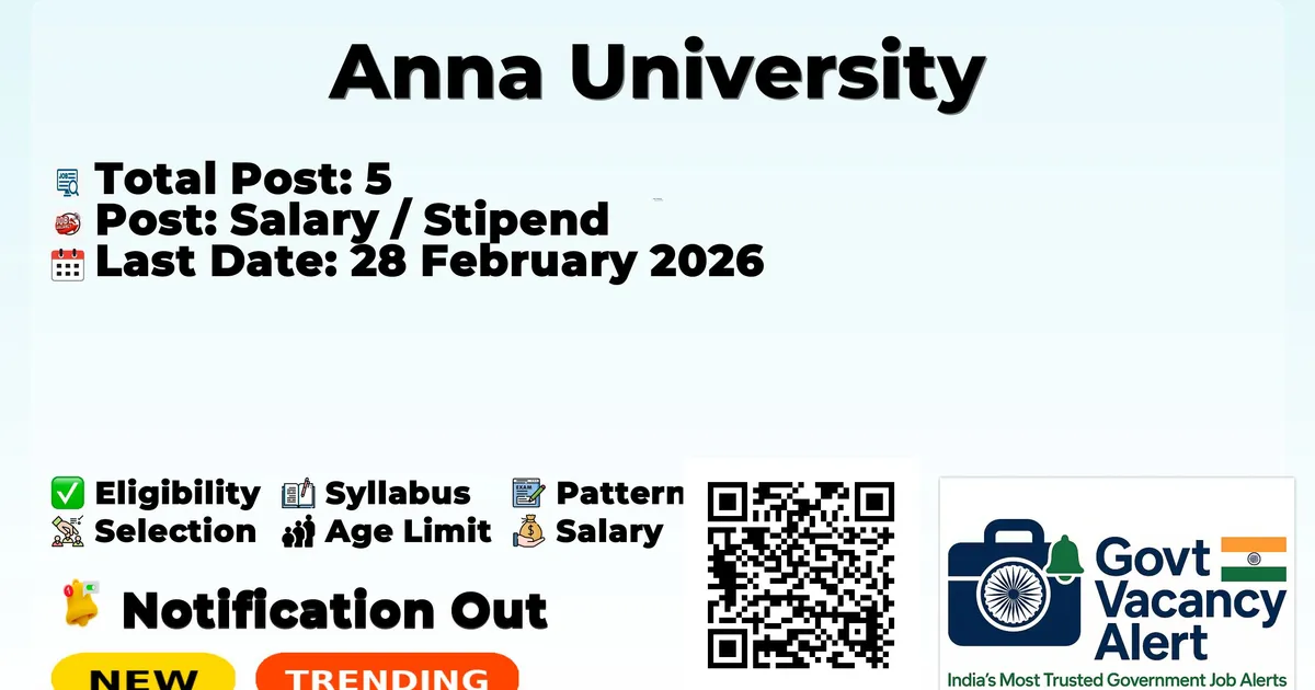 Anna University has released an official notification for the recruitment of 05 Project Associate Posts. Interested and eligible candidates can apply Online through the official Anna University website. The last date to submit the application form is 28-02-2026. In this article, you’ll find the Anna University Project Associate Posts recruitment details, including eligibility criteria, age limit, salary structure, selection process, application steps, and direct links to the official notification and Online application form.