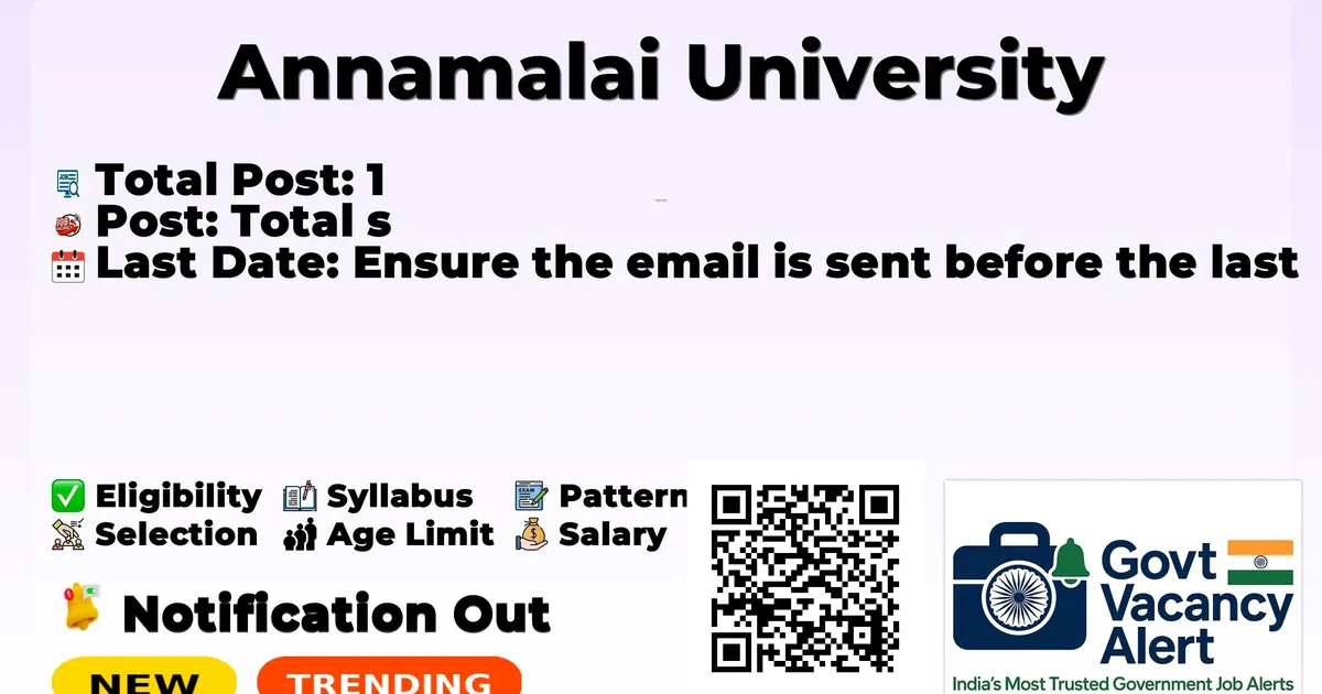 Annamalai University has released the Annamalai University Project Associate Recruitment 2026 notification for 1 Project Associate (Full Time) post on a contractual basis under a research project. FreeJobAlert - Your Personal Govt Job Finder 10M+Users 100+Jobs/day FreeAlways ⚡ Get Custom Govt Job Alerts - Alerts by Qualification, State and Interest. Set Free Alerts ● Free · No spam · Unsubscribe anytime · freejobalert.com Candidates must possess M.E./M.Tech. in Manufacturing Engineering, Mechanical Engineering, Robotics, Electronics or Instrumentation, or M.Sc. in Physics, Electronics, Instrumentation or Marine Science with a minimum of 55% marks from a recognized university, within the prescribed maximum age limit of 35 years, with applicable age relaxation as per Tamil Nadu Government norms. This latest university job at Annamalai University offers a monthly salary of ₹25,000 plus House Rent Allowance (HRA), and the selection process will be based on qualification screening followed by an interview (online or offline), making this a suitable opportunity for postgraduate candidates seeking research and project-based engineering or science jobs in Tamil Nadu. Advertisement Company Name Annamalai University Post Name Project Associate No of Posts 1 Salary Rs. 25000 + HRA Per Month Qualification M.E./M.Tech, M.Sc Age Limit Max: 35 years Last Date 26-03-2026 Apply Mode Email Job Type Contractual Candidates who are interested in applying for the Annamalai University Recruitment 2026 should first download and carefully read the official notification PDF. The notification contains complete details about vacancy distribution, eligibility criteria, age limit, stipend/salary, selection process, important dates, and application instructions. Reading the official document is important to ensure that you meet all requirements before submitting the application form. Download Annamalai University Project Associate Job 2026 Notification PDF The Annamalai University Project Associate Recruitment 2026 notification announces a total of 1 vacancy for the Project Associate (Full Time) post on a contractual basis. Post Name Total Posts Project Associate (Full Time) 1 Total 1 M.E./M.Tech. in Manufacturing Engineering/Mechanical Engineering/Robotics/Electronics/Instrumentation with minimum 55% marks OR M.Sc. in Physics/Electronics/Instrumentation/Marine Science with minimum 55% marks. Maximum Age Limit: 35 years. Age relaxation for SC/ST/OBC/PWD candidates will be applicable as per Tamilnadu Government norms. Rs. 25000 + HRA Per Month Event Date Notification Date 16 March 2026 Last Date for Application 26 March 2026 Screening based on qualifications and skills Interview (online or offline) Candidates who wish to apply for Annamalai University Project Associate Recruitment 2026 via email should follow the steps below. Read the official notification carefully before applying. Prepare your application with complete bio-data including personal details, educational qualifications, and experience. Attach self-attested copies of all required documents such as educational certificates, experience certificates, ID proof, and recent passport-size photographs. Clearly mention the post applied for in the subject line of the email. Send the complete application to the official email address mentioned in the notification. Ensure the email is sent before the last date: 26-03-2026. Keep a copy of the sent email for future reference. Link Description Link Apply Link Click here Official Notification PDF Click here Official Website Click here FreeJobAlert - Your Personal Govt Job Finder 10M+Users 100+Jobs/day FreeAlways ⚡ Get Custom Govt Job Alerts - Alerts by Qualification, State and Interest. Set Free Alerts ● Free · No spam · Unsubscribe anytime · freejobalert.com