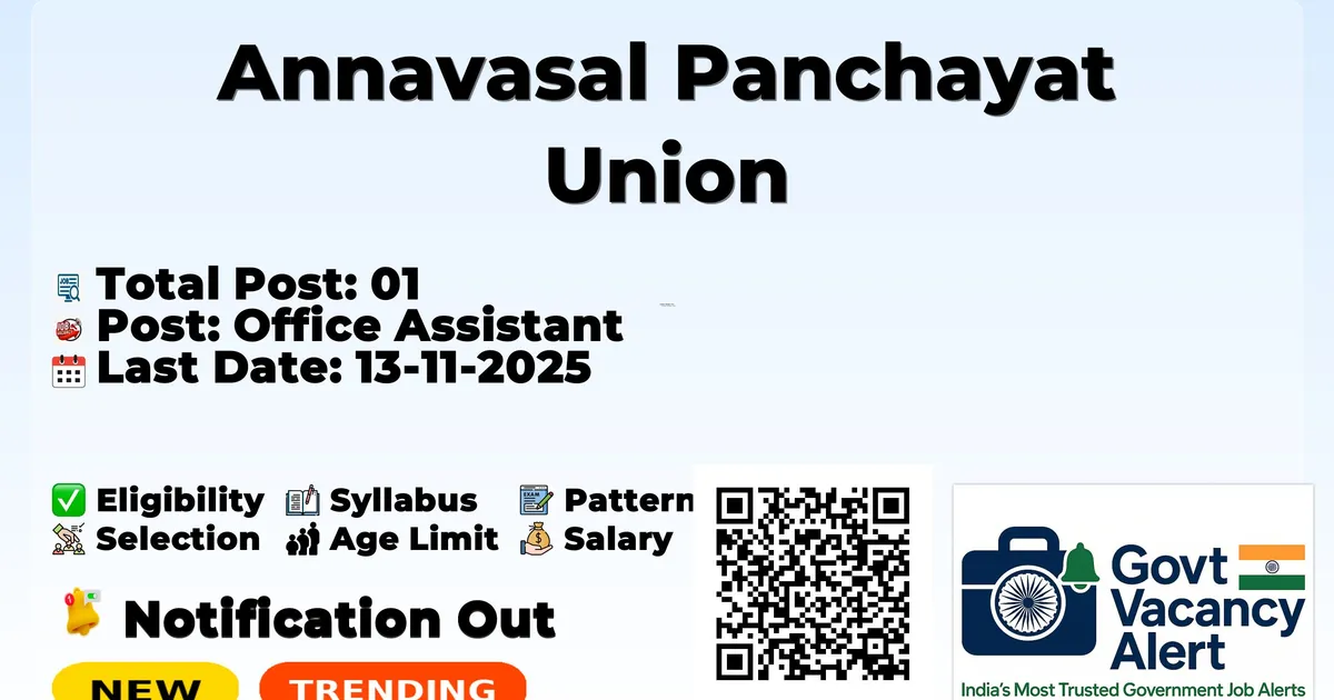 Company Name Annavasal Panchayat Union Post Name Office Assistant No of Posts 01 Pay Matrix Rs. 15700-58100 Qualification 8TH Age Limit 18 to 37 years Start Date for Apply 04-11-2025 Last Date for Apply 13-11-2025 Official Website pudukkottai.nic.in