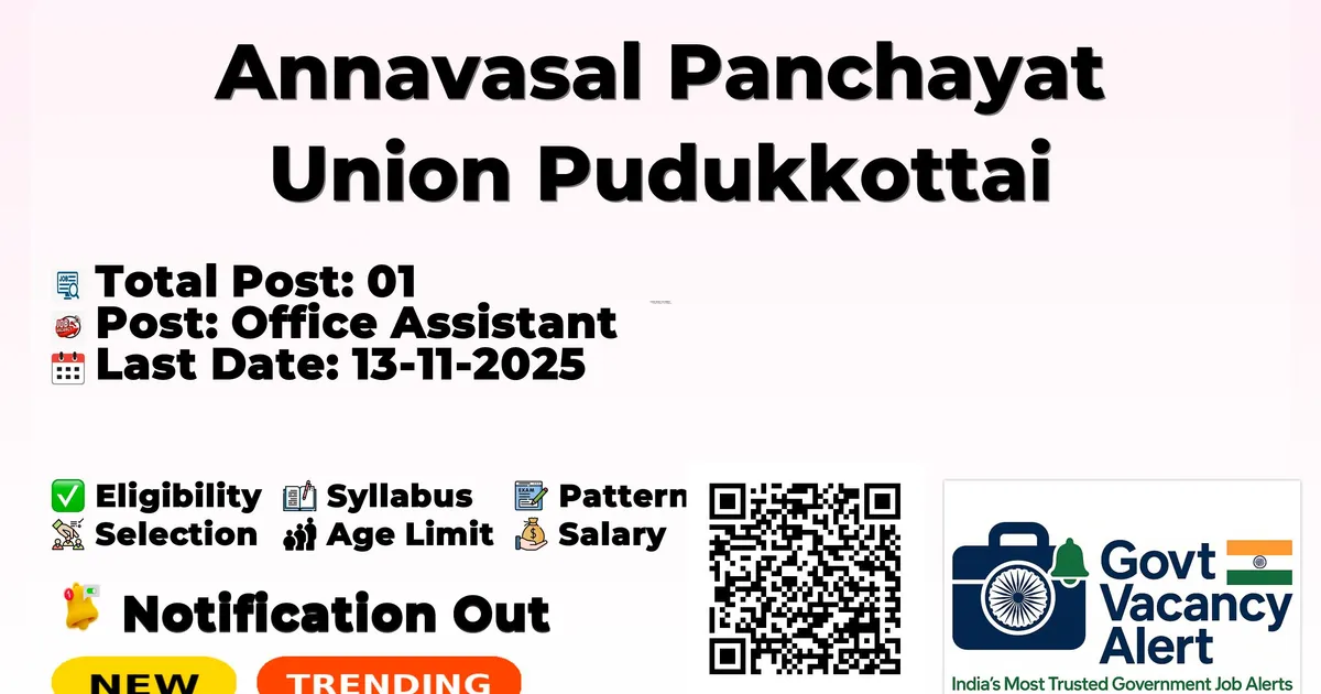 Annavasal Panchayat Union Pudukkottai has released an official notification for the recruitment of 01 Office Assistant Posts. Interested and eligible candidates can apply Offline through the official Annavasal Panchayat Union Pudukkottai website. The last date to submit the application form is 13-11-2025. In this article, you’ll find the Annavasal Panchayat Union Pudukkottai Office Assistant Posts recruitment details, including eligibility criteria, age limit, salary structure, selection process, application steps, and direct links to the official notification and Offline application form.