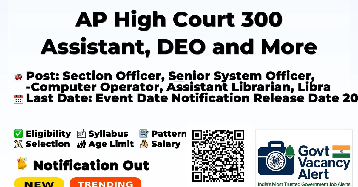 Particulars Details Organization High Court of Andhra Pradesh, Amaravati Notification No. 01/2026/Estt., Dated 20.03.2026 Post Name Section Officer, Senior System Officer, Computer Operator, Assistant Librarian, Librarian Grade-II, U.D. Stenographer, Assistant, Examiner, Typist, Copyist, Data Entry Operator, Stenographer, Office Subordinate Category Direct Recruitment Total Posts 300 Salary Section Officer: ₹57,100 - ₹1,47,760 Senior System Officer: ₹44,570 - ₹1,27,480 Computer Operator: ₹40,970 - ₹1,24,380 Assistant Librarian: ₹40,970 - ₹1,24,380 Librarian Grade-II: ₹35,570 - ₹1,09,910 U.D. Stenographer: ₹34,580 - ₹1,27,480 Assistant/Examiner/Typist/Copyist/DEO/Stenographer: ₹25,220 - ₹80,910 Office Subordinate: ₹20,000 - ₹61,960 Job Location Andhra Pradesh High Court, Amaravati Application Mode Online only (via APHC Official Website) Selection Process Computer Based Examination + Skill Test (for selected posts)