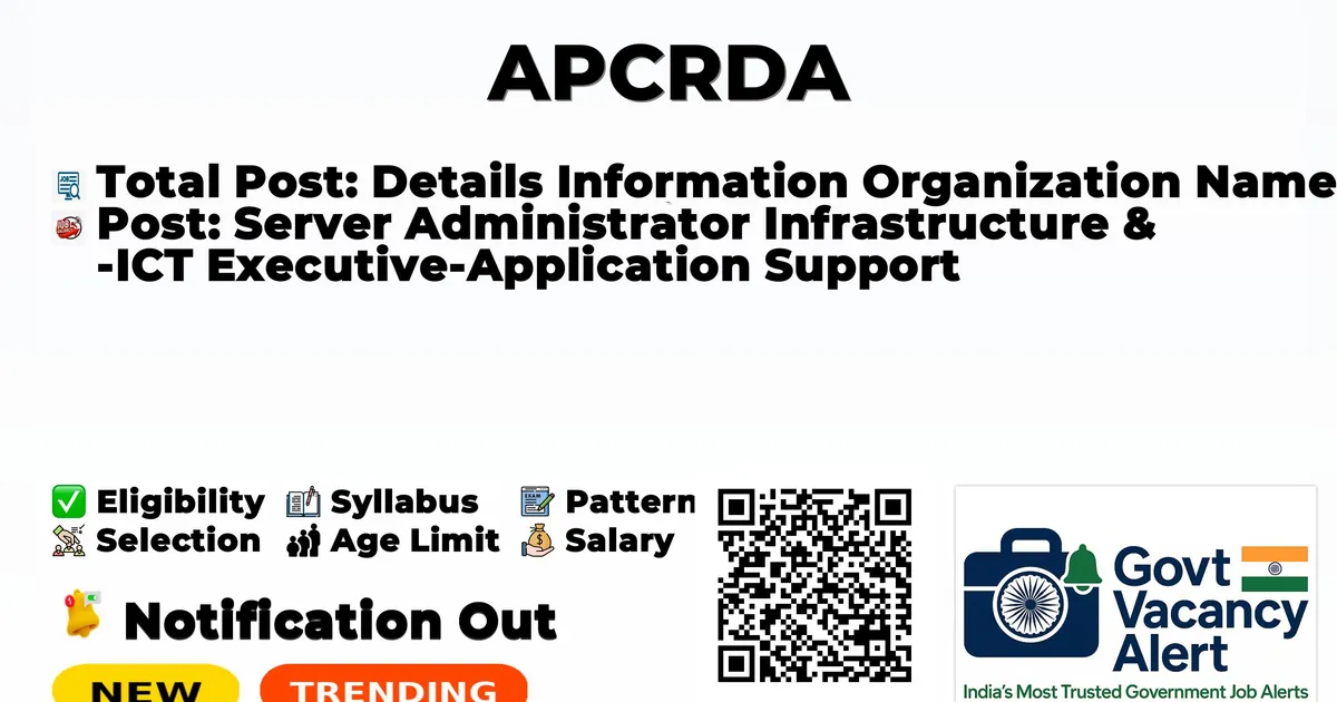 Details Information Organization Name Andhra Pradesh Capital Region Development Authority (APCRDA) Company Name in Short Form APCRDA Post Name Server Administrator Infrastructure & ICT Executive-Application Support Notification Date dd/mm/yyyy 15 December 2025 Total Vacancy Count 2 Posts (1 per position) Advertisement Number 26/2025 Qualification Graduate in Engineering/CS/Computer Applications Start Date 17 December 2025 Last Date 30 December 2025 Pincode 522237 Address Rayapudi Village, Thullur Mandal, Pin Code 522237 Job Type: Full Time or Part Time Contract basis Application Mode Online Official Website crda.ap.gov.in APCRDA Server Administrator & ICT Executive 2025 Vacancy Details The total number of vacancies for APCRDA Recruitment 2025 is 2 posts, one for each position: Server Administrator Infrastructure: 01 Post ICT Executive-Application Support: 01 Post Eligibility Criteria Candidates must meet specific educational and experience criteria for each post: Educational Qualification Server Administrator Infrastructure: A Graduate degree in Engineering/ Computer Science/ Computer Applications with 8 years of relevant experience in server installation, configuration, and maintenance. ICT Executive-Application Support: A Graduate degree in Engineering in any discipline or Computer Applications with 3 years of overall experience in IT application project execution, operation, and maintenance. Selection Process for APCRDA Server Administrator & ICT Executive 2025 The selection process will likely involve screening applications based on qualifications and experience, followed by interviews for shortlisted candidates. The Corporation reserves the right to fill or not fill the notified posts. Salary/Stipend A fixed consolidated pay will be offered commensurate with experience. The salary is noted as being negotiable for the right candidate. The average salary range for general employees at APCRDA is around ₹15.0 lakhs per year. How to Apply for APCRDA Recruitment 2025? Eligible candidates can apply online for APCRDA Recruitment 2025 by following these steps: Visit the official APCRDA website: https://crda.ap.gov.in. Navigate to the "careers" or "Career Cell" tab. Fill and submit the online application form from 17December 2025 to 30December 2025. Applications received through any other source or mode will not be processed. Instructions The engagement is purely on a contract basis for an initial period of one year. Preference will be given to applicants with at least 5 years of experience in central/state government institutions or PSUs. The posts are subject to vary based on project needs, and APCRDA reserves the right to modify or cancel the notification. The place of work is APCRDA, Amaravati. APCRDA Server Administrator, ICT Executive 2025 – Important Links Link Type Action Official Notification PDF Download PDF Apply Online Click here to Apply Official Website Visit Website Join Arattai Channel Join Now Join Telegram Channel Join Telegram Join WhatsApp Channel Join WhatsApp Sarkari Result Vacancy Check Here Download Mobile App Get App Follow Us on Add us on Google News Twitter APCRDA Server Administrator, ICT Executive Recruitment 2025 - FAQs 1. What is the starting date to apply online for APCRDA Server Administrator, ICT Executive 2025? Ans: Starting Date to apply online is 17 December 2025. 2. What is the last online apply date for APCRDA Server Administrator, ICT Executive 2025? Ans: Last online apply date is 30 December 2025. 3. What is the Eligibility to apply for APCRDA Server Administrator, ICT Executive 2025? Ans: B.Tech/ B.E 4. What is the Maximum Age Limit to apply for APCRDA Server Administrator, ICT Executive 2025? Ans: 26/2025 Years 5. How many vacancies are being recruited by APCRDA Server Administrator, ICT Executive 2025? Ans: Total 02 Vacancies.
