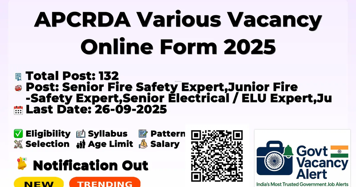 APCRDA Various Vacancy Online Form 2025 — Senior Fire Safety Expert,Junior Fire Safety Expert,Senior Electrical / ELU Expert,Junior Electrical / ELU Expert,Senior Plumbing Expert,Junior Plumbing Expert,Senior HVAC Expert,Junior HVAC Expert,Chief Engineer,Superintending Engineer,Executive Engineer,Deputy Executive Engineer,Assistant Executive Engineer/ Assistant Engineer
