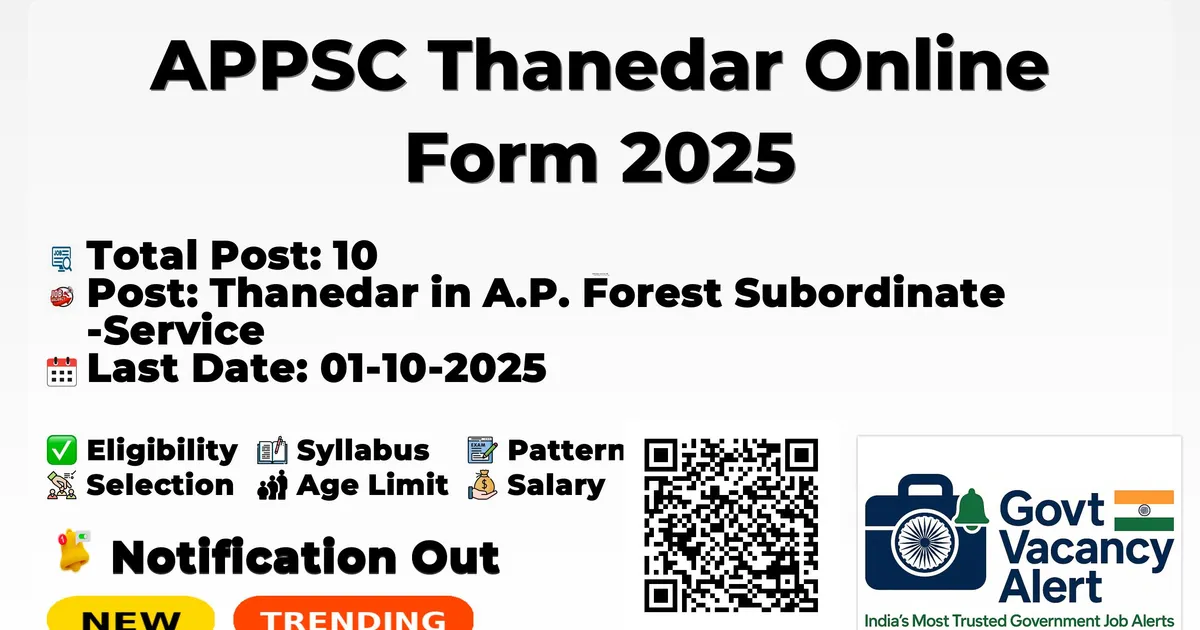 The Andhra Pradesh Public Service Commission (APPSC) Recruitment 2025 for 10 posts of Thanedar. Candidates Can Apply Online. The online application opens on 11-09-2025, and closes on 01-10-2025. The candidate shall apply online through APPSC website, psc.ap.gov.in.