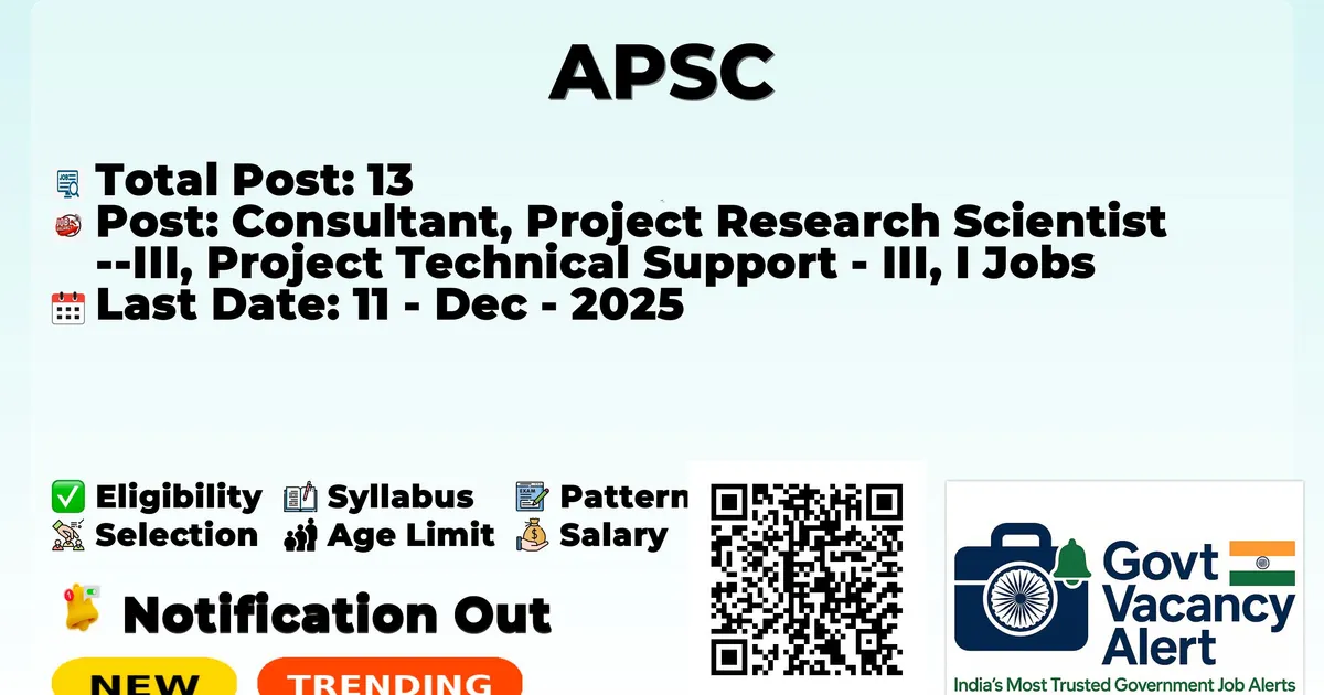 APSC — Consultant, Project Research Scientist -III, Project Technical Support - III, I Jobs - 13 Posts