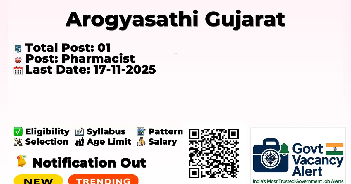 Arogyasathi Gujarat has released an official notification for the recruitment of 01 Pharmacist Posts. Interested and eligible candidates can apply Online through the official Arogyasathi Gujarat website. The last date to submit the application form is 17-11-2025. In this article, you’ll find the Arogyasathi Gujarat Pharmacist Posts recruitment details, including eligibility criteria, age limit, salary structure, selection process, application steps, and direct links to the official notification and Online application form.