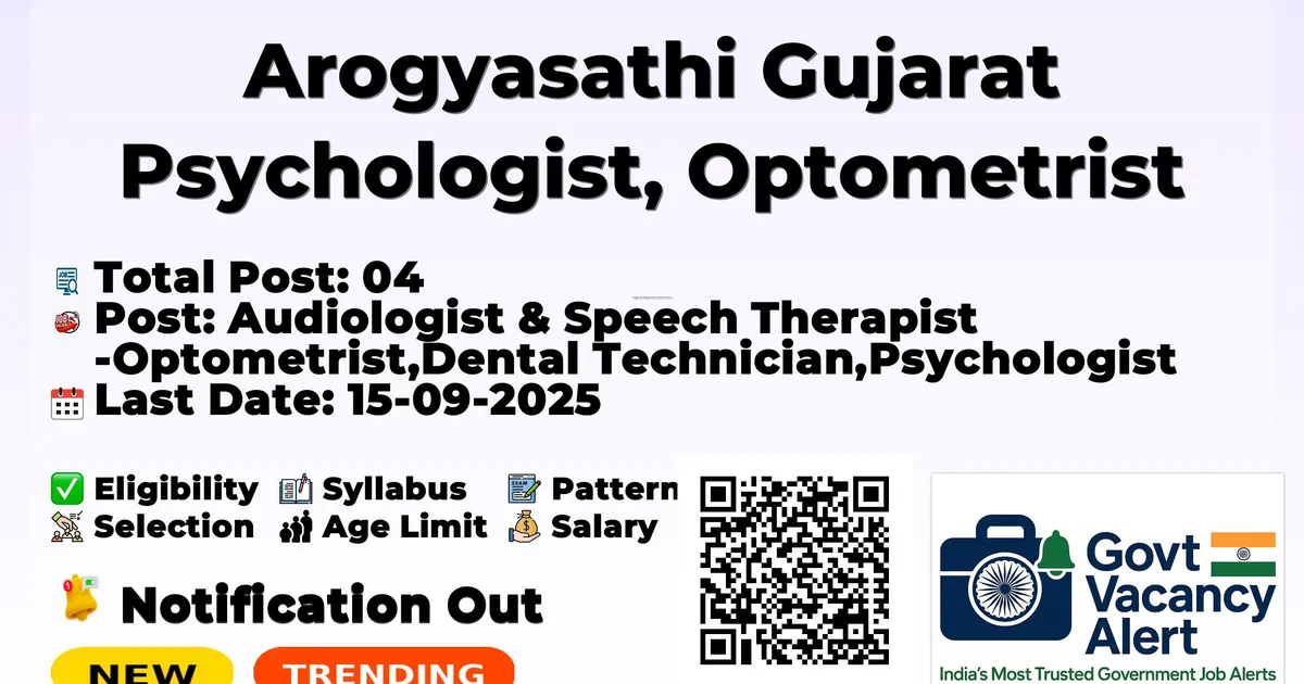 The Arogyasathi Gujarat Psychologist, Optometrist and Other Recruitment 2025 Notification PDF has been released on 09-09-2025 at arogyasathi.gujarat.gov.in. Check the complete job details, vacancy, age limit, application fee, selection process and how to apply from the article.You can Check all Latest Sarkari Result Updates of All Central Government Jobs and State Government Jobs.