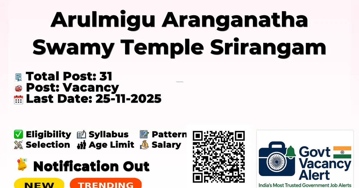 Arulmigu Aranganatha Swamy Temple Srirangam has released an official notification for the recruitment of 31 Junior Assistant, Sweeper and More Posts. Interested and eligible candidates can apply Offline through the official Arulmigu Aranganatha Swamy Temple Srirangam website. The last date to submit the application form is 25-11-2025. In this article, you’ll find the Arulmigu Aranganatha Swamy Temple Srirangam Junior Assistant, Sweeper and More Posts recruitment details, including eligibility criteria, age limit, salary structure, selection process, application steps, and direct links to the official notification and Offline application form.