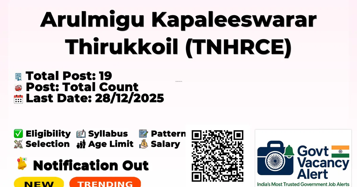 Arulmigu Kapaleeswarar Temple (TNHRCE) has released an official notification for the recruitment of 19 Assistant Engineer, Junior Assistant and More Posts. Interested and eligible candidates can apply Offline through the official TNHRCE website. The last date to submit the application form is 28-12-2025. In this article, you’ll find the TNHRCE Assistant Engineer, Junior Assistant and More Posts recruitment details, including eligibility criteria, age limit, salary structure, selection process, application steps, and direct links to the official notification and Offline application form.