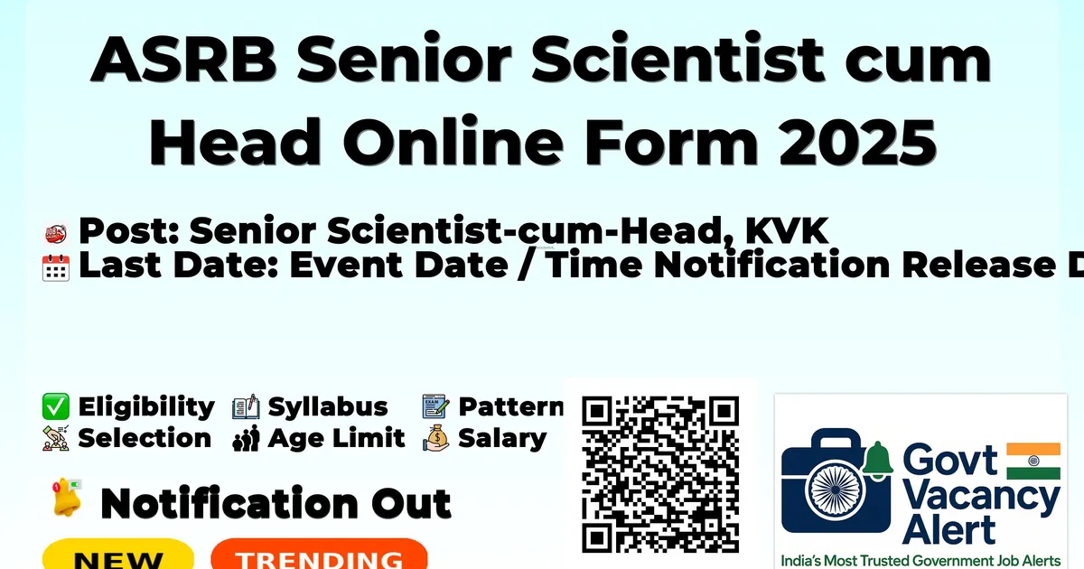 Details Information Organization Name Agricultural Scientists Recruitment Board (ASRB) Post Name Senior Scientist-cum-Head, KVK Total Vacancies 8 Posts Salary/Pay Scale Research Level-13A Rs. 1,31,400 – 2,17,100 (equivalent to pre-revised PB-4 Rs. 37400–67000 + RGP Rs. 9,000) Educational Qualification Doctoral degree in Agricultural Sciences including relevant basic sciences with prescribed experience as detailed in the notification for each post Age Limit Upper age limit 47 years as on 22/01/2026 (no upper age limit for ICAR employees) Application Start Date 22/12/2025 Application End Date 22/01/2026 Application Mode Online Official Website asrb.org.in / asrb.gov.in