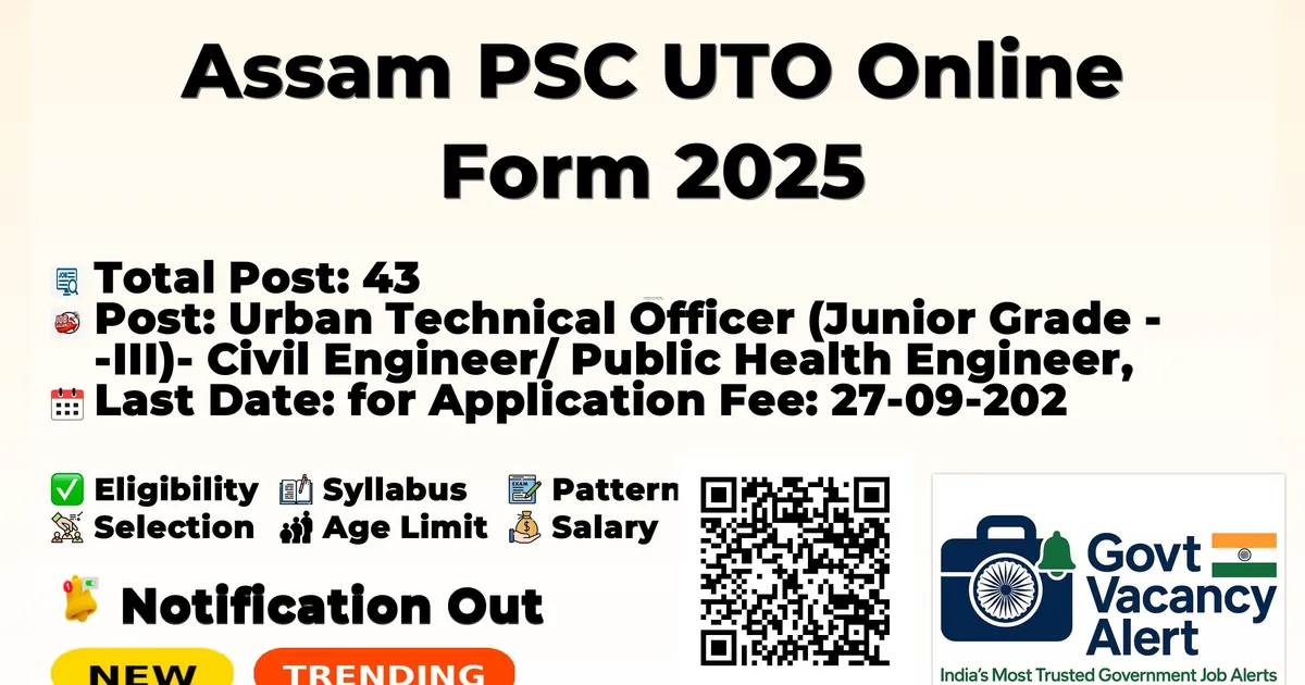 The Assam Public Service Commission (Assam PSC) Recruitment 2025 for 43 posts of Urban Technical Officer. Candidates with B.Tech/B.E Can Apply Online. The online application opens on 05-09-2025, and closes on 25-09-2025. The candidate shall apply online through Assam PSC website, apsc.nic.in.