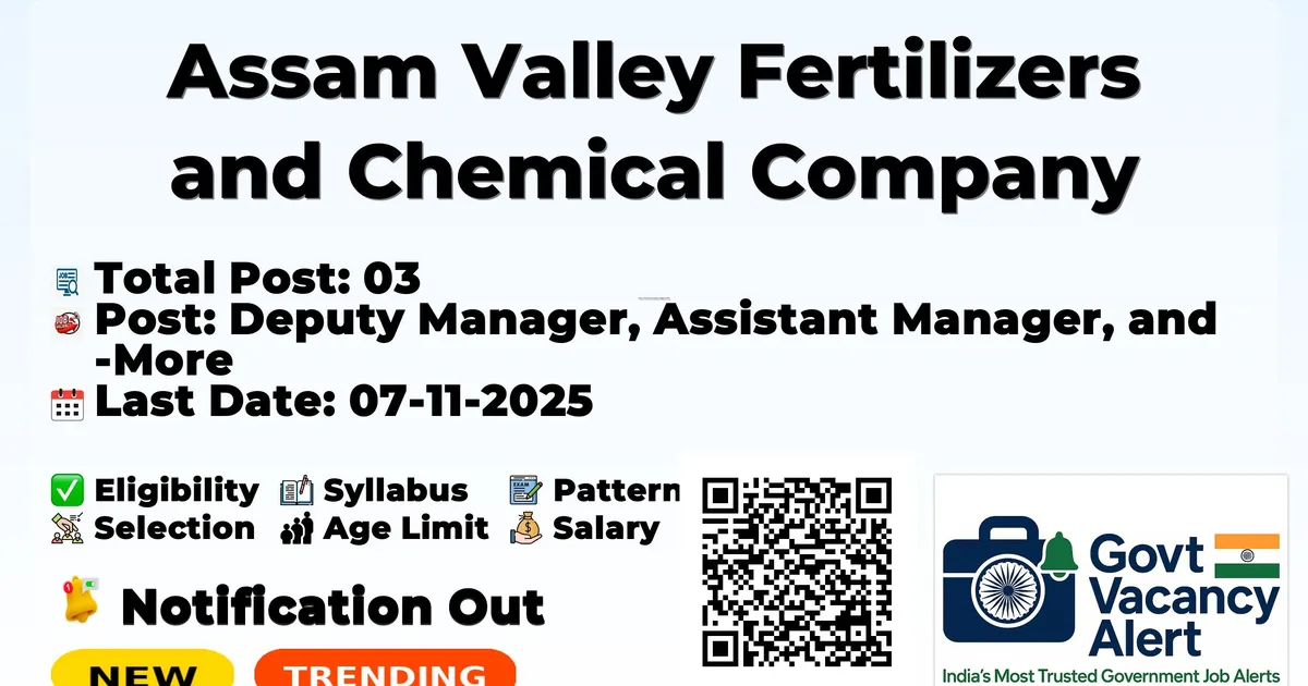 Assam Valley Fertilizers and Chemical Company (AVFCCL) has released an official notification for the recruitment of 03 Deputy Manager, Assistant Manager, and More Posts. Interested and eligible candidates can apply Online through the official AVFCCL website. The last date to submit the application form is 07-11-2025. In this article, you’ll find the AVFCCL Deputy Manager, Assistant Manager, and More Posts recruitment details, including eligibility criteria, age limit, salary structure, selection process, application steps, and direct links to the official notification and Online application form.