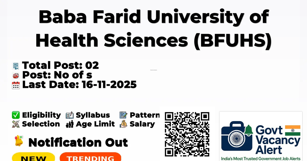 Baba Farid University of Health Sciences (BFUHS) has released an official notification for the recruitment of 02 Director Posts. Interested and eligible candidates can apply Online through the official BFUHS website. The last date to submit the application form is 16-11-2025. In this article, you’ll find the BFUHS Director Posts recruitment details, including eligibility criteria, age limit, salary structure, selection process, application steps, and direct links to the official notification and Online application form.