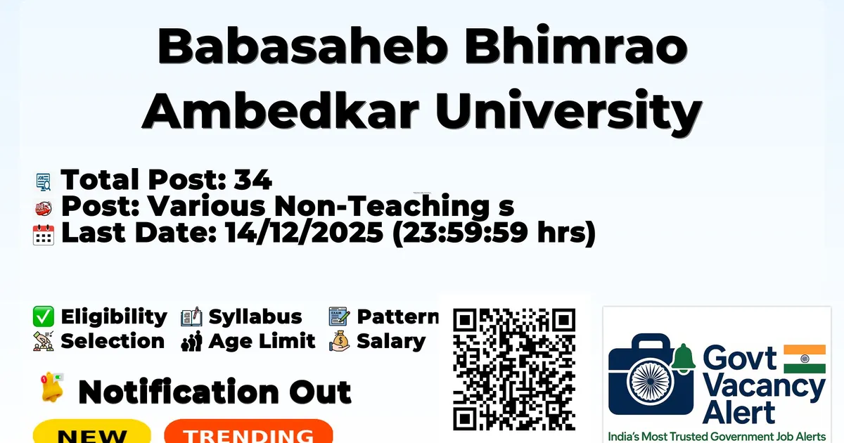 Company Name Babasaheb Bhimrao Ambedkar University (BBAU) Post Name Various Non-Teaching Posts No of Posts 34 Salary Level 1 to Level 12 (7th CPC) Qualification 10th Pass to Post Graduate with relevant experience Age Limit 25 to 56 years Start Date for Apply 14/11/2025 Last Date for Apply 14/12/2025 (23:59:59 hrs) Official Website www.bbau.ac.in