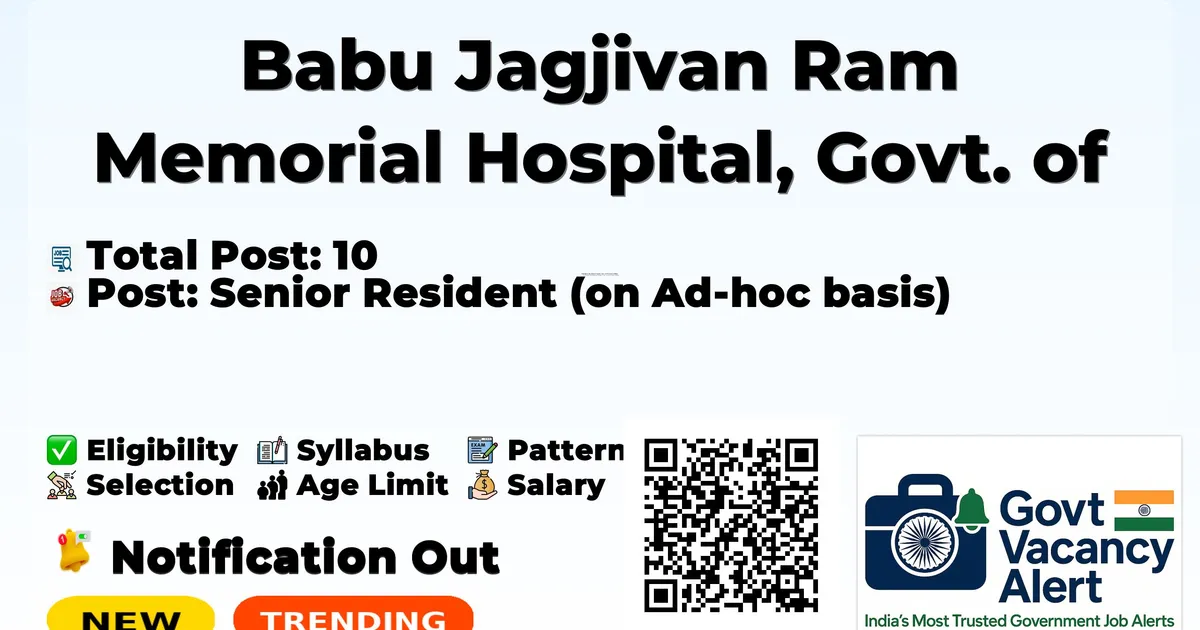 Company Name Babu Jagjivan Ram Memorial Hospital, Govt. of NCT of Delhi (BJRMH) Post Name Senior Resident (on Ad-hoc basis) No of Posts 10 Salary Pay Matrix Level-11 (₹67,700 – ₹2,08,700) + Allowances Per Month Qualification MBBS + PG Degree/Diploma in concerned specialty Age Limit 45 years (as on date of interview) Walkin Date 28-11-2025 Official Website https://health.delhi.gov.in