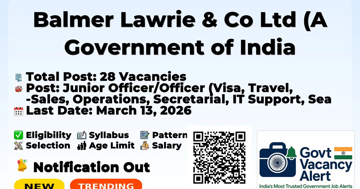 Company Name Balmer Lawrie & Co Ltd (A Government of India Enterprise) Post Name Junior Officer/Officer (Visa, Travel, Sales, Operations, Secretarial, IT Support, Sea CHA), Assistant Manager (Travel, Sales, Rail Operations), Deputy Manager (Manufacturing), Unit Head (W&D), Officer (Sales-MICE) No of Posts 28 Vacancies Salary Grade: FTO-1, FTO-2, FTE-1, E1 (40000-140000), E2 (50000-160000) (Salary details not specified) Qualification Any Graduate Bachelor's Degree (10+2+3), MTM/Equivalent/MBA/Graduate Engineer, Full Time Engineering Graduate, Graduate Degree in various disciplines Age Limit Maximum 30 Years (Junior Officer/Officer posts), Maximum 32 Years (Assistant Manager/Deputy Manager/Unit Head posts) Last Date for Apply March 13, 2026 Official Website www.balmerlawrie.com