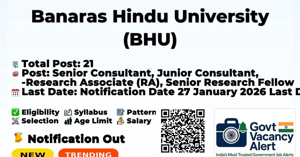 Banaras Hindu University (BHU) has released an official notification for the recruitment of 21 Senior Consultant, Junior Consultant and More Posts. Interested and eligible candidates can apply Offline through the official BHU website. The last date to submit the application form is 16-02-2026. In this article, you’ll find the BHU Senior Consultant, Junior Consultant and More Posts recruitment details, including eligibility criteria, age limit, salary structure, selection process, application steps, and direct links to the official notification and Offline application form.