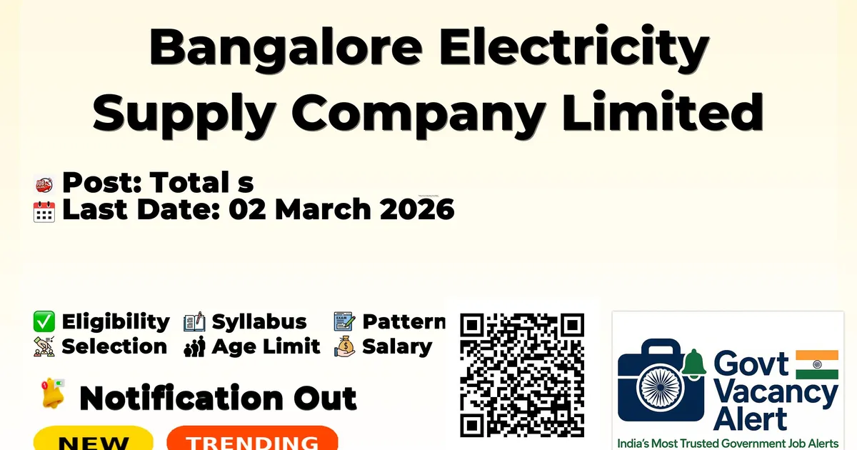 Company Name Bangalore Electricity Supply Company Limited (BESCOM) Post Name Apprentice Number of Posts 520 Advertisement Number BESCOM/GM (A&HR)/DGM (HRD)/BC-40/2025-26/CYS-99 Salary / Stipend Rs. 9,008/- per month (Graduates); Rs. 8,000/- per month (Diploma Holders) Qualification B.E./B.Tech in Electrical & Electronics Engineering, B.A./B.Sc./B.Com./B.B.A./B.C.A./B.B.M./B.E./B.Tech (other branches), or 3-year Diploma from recognized institutions in Karnataka Age Limit Minimum 18 years Notification Date 06 February 2026 Last Date to Apply 02 March 2026 Application Mode Online Job Type Contract