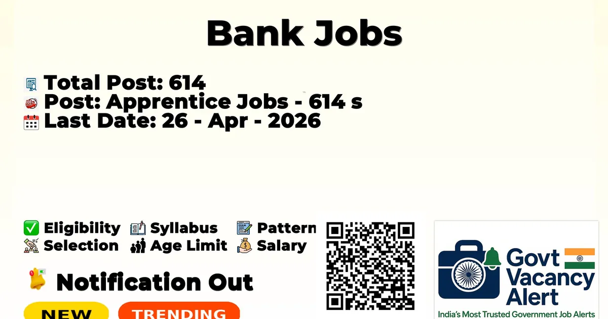 The Jammu & Kashmir Bank Limited (JK Bank) has officially released the notification to fill the vacancies of 614 Apprentice Posts. Interested and eligibile candidates can use this opportunity to apply for these posts before the last date of application. Candidates who have completed their Any Degree can apply for the JK Bank Jobs 2026. The interested applicants can apply in online mode. Here we have mentioned the education details, age limit, selection process, application fee, salary, and how to apply for these posts before the deadline. The application dates have already begun.