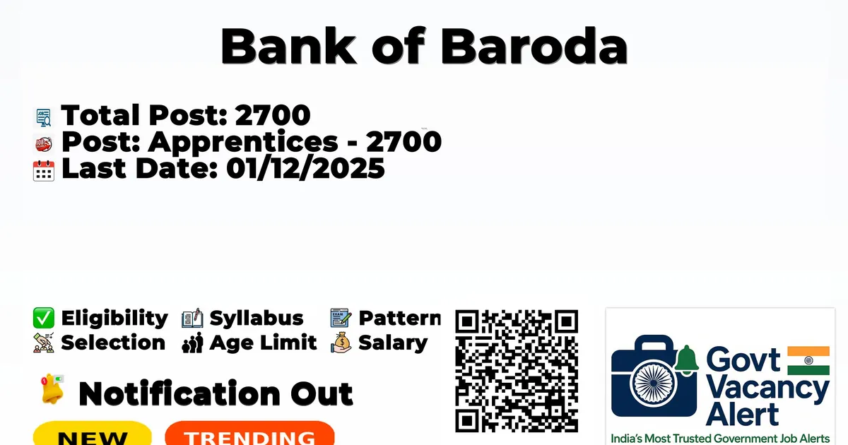 Bank of Baroda Apprentice Notification 2025-26 of 2700 Vacancies Across India for Fresher Graduates, 1 Year On-the-Job Training. The Bank of Baroda (BoB) invites online applications from Indian Citizens of Any Degree holders for engagement of Apprentices under Apprentices Act 1961. The online registration process for the BoB Apprentice Vacancy 2025-26 is scheduled from 11th November to 1st December 2025. In this Article, Job Aspirants can read the BoB Apprentice Vacancies State Wise, Eligibility Criteria, Stipend, Selection and How to Register details.