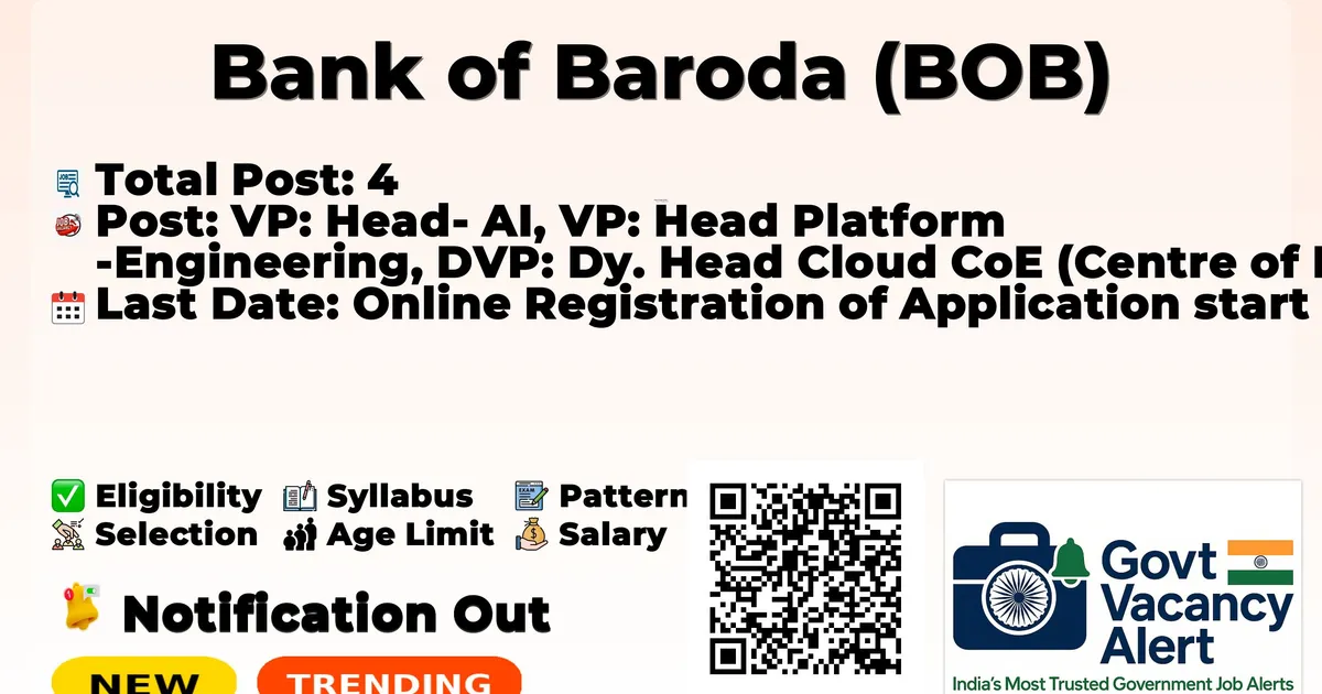 Company Name Bank of Baroda (BOB) Advt No. BOB/HRM/RFC/ADVT/2026/01 Post Name VP: Head- AI, VP: Head Platform Engineering, DVP: Dy. Head Cloud CoE (Centre of Excellence), DVP: Dy. Head IT Infrastructure No of Posts 4 Salary Remuneration will be offered based on candidate's qualifications, experience, overall suitability, last drawn salary of the candidate and market benchmark. Qualification The educational qualifications must be from the college/university recognized by the Government of India/AICTE Start Date 17/01/2026 Last Date 06/02/2026 Official Website www.bankofbaroda.bank.in